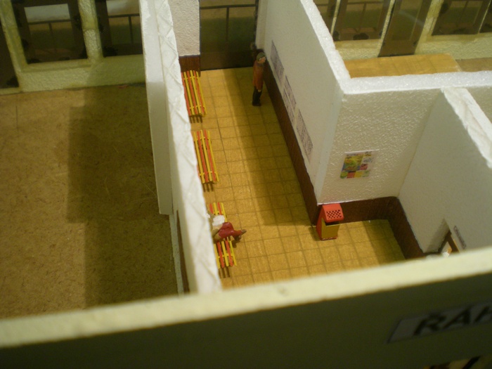 Ted doslo na cekarnu ci jak tu mistnost nazvat. Zdi ze styroduru, natreno bilou akrylatovou fasadni barvou. Podlaha z papiru opet s narezanyma dlazdicema zalamovakem a natreno temperou. Zbytek doplnku natistene zmenseniny na papir.