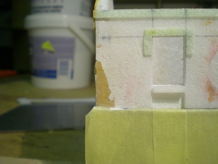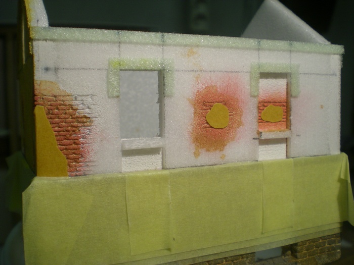 Tam kde jsem chtel aby zustala oloupana omitka, jsem cihly zalepil oboustranou lepici paskou, kde jsem nechal horni kryci papirek prilepeny. Oboustranku jsem tam dal protoze jina paska me nechtela drzet. Zaroven jsem maskoval spodni kamennou podezdivku. Tu uz jsem olepil papirovou maskovaci paskou ktera se pouziva na bezne malovani doma na zdi.