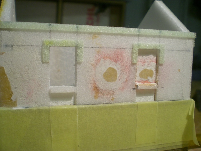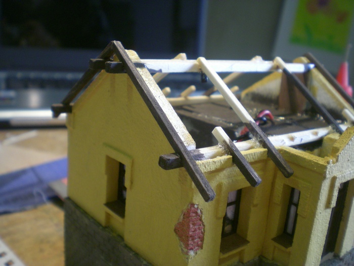 Podzednice jsou drevene hranolky 3*3mm a krovy 2*2mm. Vse natirane temperou.