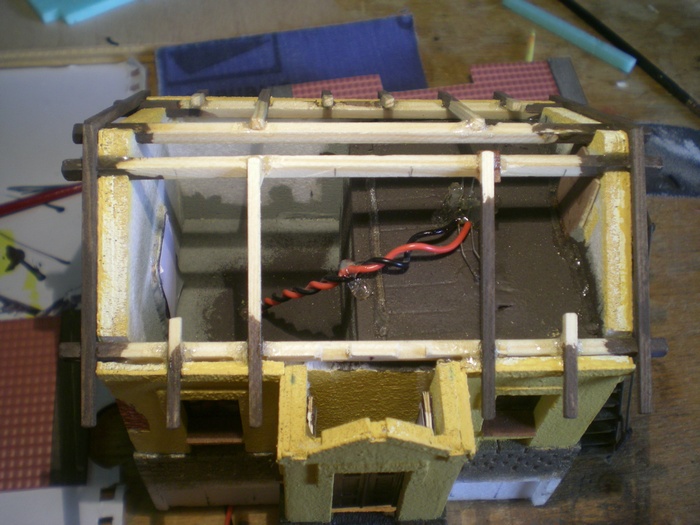 Doslo uz i na montaz osvetleni domku. Budou svitit dve protilehle okna ktere osvetluji dve led. Vytvoril jsem uz i prostor pro podzednice. Od ledek jsem pak svedl dva draty, ktere dole pod modulem uz napajim na tistak, kde musim vyzkouset jaky odpor bude vyhovovat aby to svitilo jak se me bude libit.