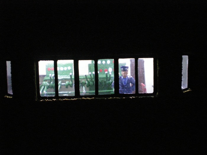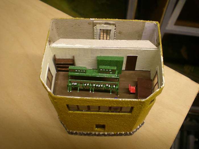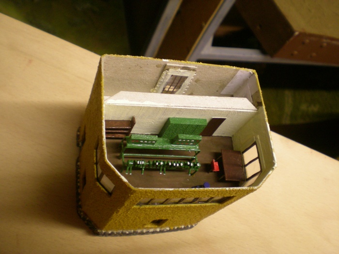 Tady uz jsem ve stavedle nainstaloval vnitrni vybaveni. Neco z papiru, styroduru a trebas i nohy od stolu jsou s kancelarskych sponek. Je to pevne U takze se da dobre nalepit na papir ze spoda.