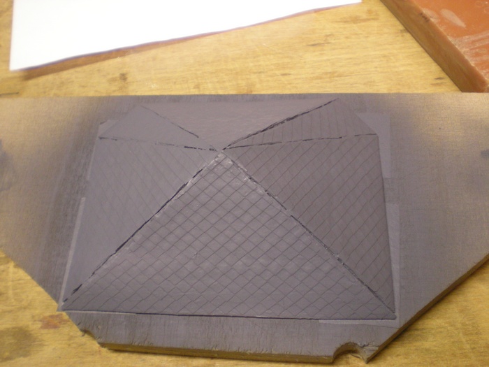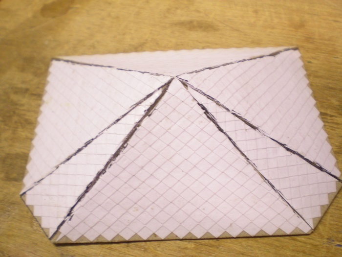 Od kolegy Bronislava jsem si pucil krejcovske nuzky ktere umi strihat takovy cik-cak tvar. Pomoci nich jsem si nastrihal pasky a z nich jsem postupne lepil material strechy. Imitovat to ma eternit. Je stim celkem dlouha prace, ale vysledek se me osobne libi.