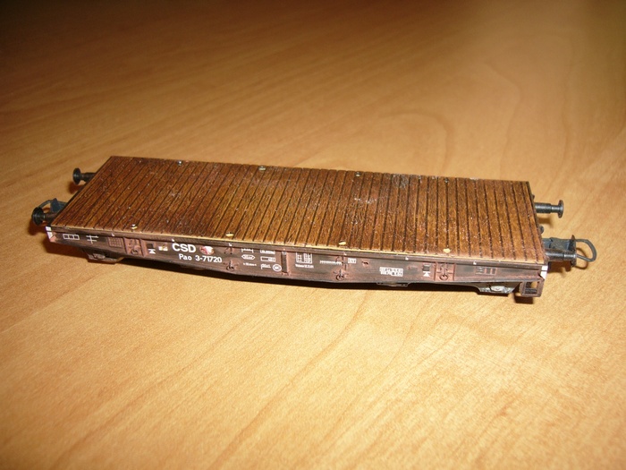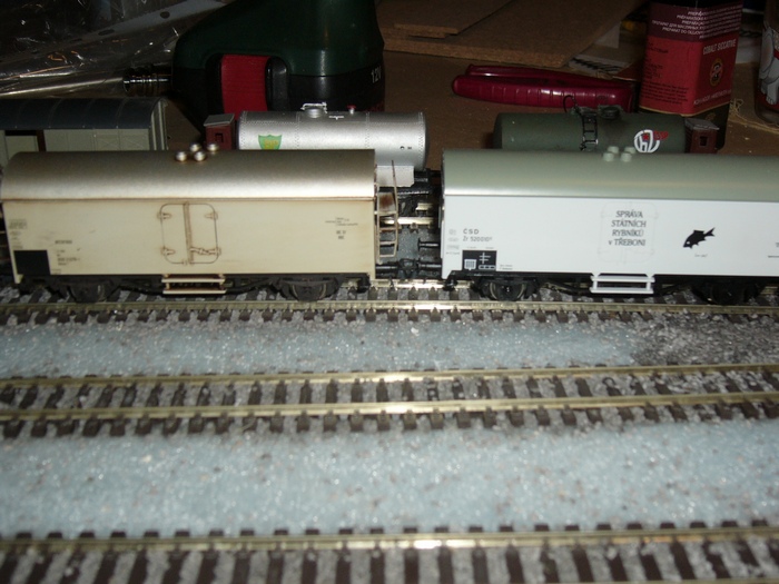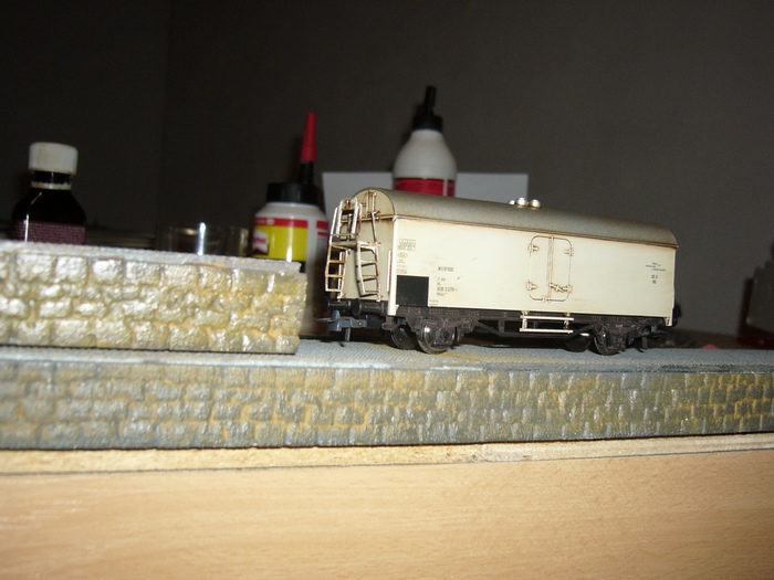 Když už jsem se dnes patlal s barvama,zkusil jsem napatinovat chladící vůz.Jako návod jsem použil patinu dle Houmra,na skříň vozu umbra pálená,na podvozek pouze pigment rez.Tady je výsledek: