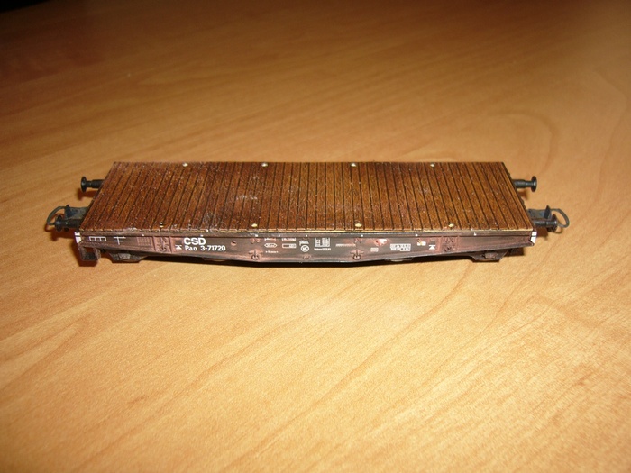 Další pokus,teď už s patinátory AGAMA a olejovou barvou,olejovkou jsou přetřené desky na podlaze vozu a provozní omšení a rez už je patinátory.Trošku jsem to sice přehnal,ale to chce víc pokusů a míň prášku
