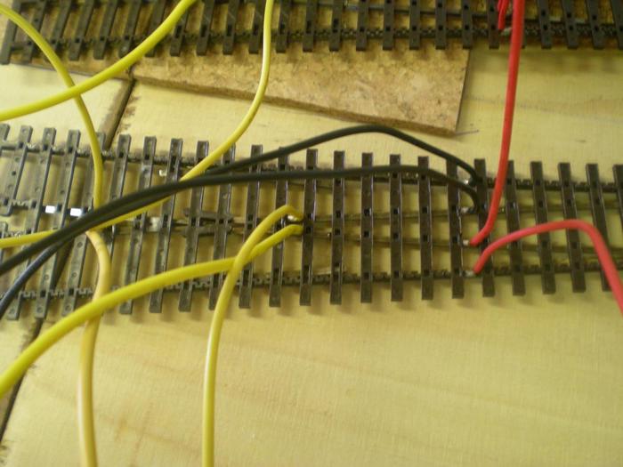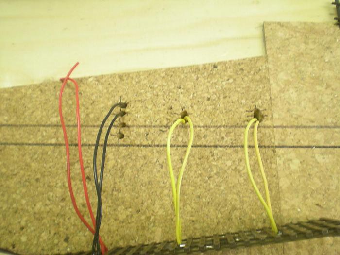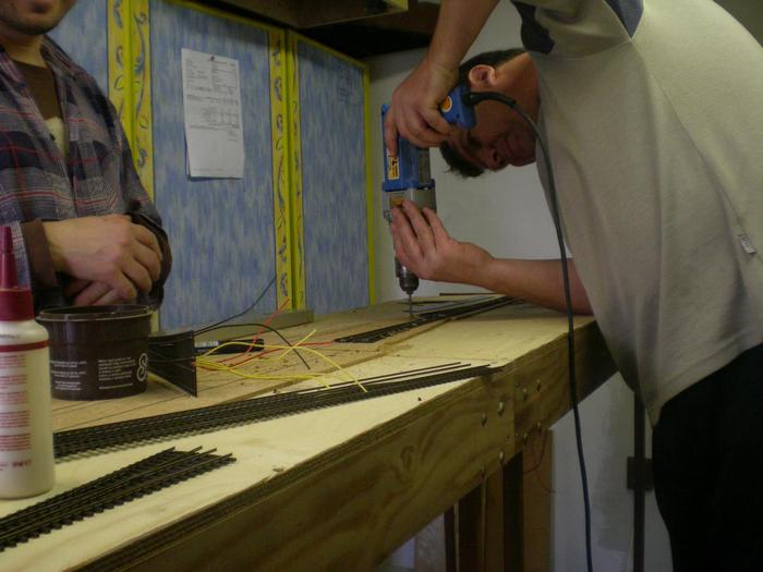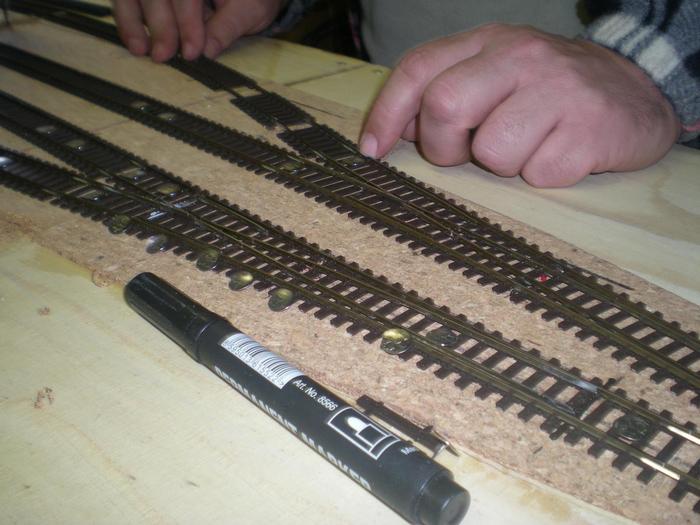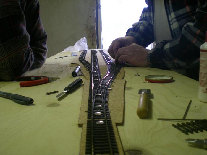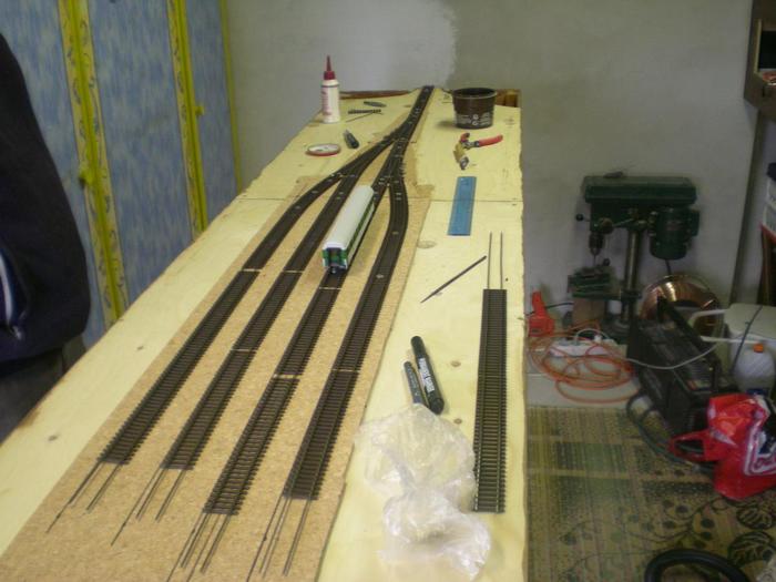 Překvapení,veksle se nám povedly,ručně fungují.Vyměřil jsem zhlaví,nalepil korek,naskládal bedny do auta a vyrazil do Písku za Hanušem.Složili jsme bedny za sebe,vyměřili osu a začali malovat koleje.Pak rozborka,stěhování do tepla.Po vyrovnání do váhy začalo vlastní pokládání zhlaví.Vrtání otvorů pro dráty a usazování vekslí je práce nad jiné zajímavá,hodně se nám líbila.Všechno jednou skončí a tak jsme se po úspěšném položení zhlaví pustili do již nudného pokládání kolejí na druhém dílu nádraží.Práce o hodně jednodužší,jenom je potřeba kontrolovat přímost prutů.Takže výsledek pracovní neděle je položení zhlaví a přímých kolejí na prvním a druhém modulu,na třetím modulu jsou koleje položené na rýsováčky.Pokračování příště.