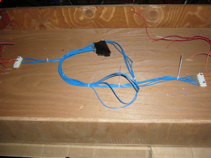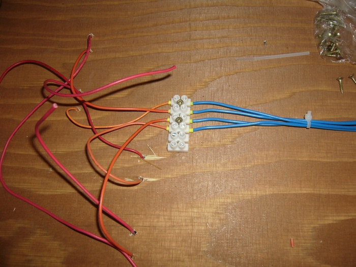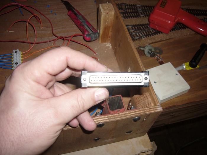 dnes jsem se pustil do elektroinstalace na modulu staničních kolejí.Snažím se to už udělat na hotovo,ale dělám to prvně tak případné připomínky vítám.Při pokládce kolejí jsme rozdělili barvy,kde zůstává červená a místo černé je oranžová.Ta je použita na izolované úseky.Bohužel dnes v místní prodejně elektro oranžovou neměli,tak nezbývalo než použít jinou barvu.Z nabídky pastelových barev jsem zvolil modrou,dále k mání byla černá,červená a zelenožlutá.Proto vyhrála modrá.K tomu trochu dutinek a čokolád.Dráty od úseků jsem spojil přes čokolády do svazku a potom do vícepinového konektoru.Červený a černý drát potáhnu zvlášť a propojím čokolády na modulu,na další přejdu zase konektorem,ale čtyřpinovým.Doufám,že to není špatně a bude to fungovat.Na dalším modulu budou dva moduly obsazení,měl bych obsáhnout obě zhlaví zvlášť a staniční koleje.Pár foto z drátování.