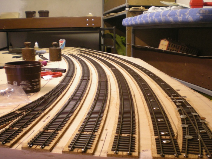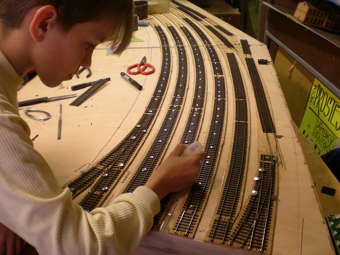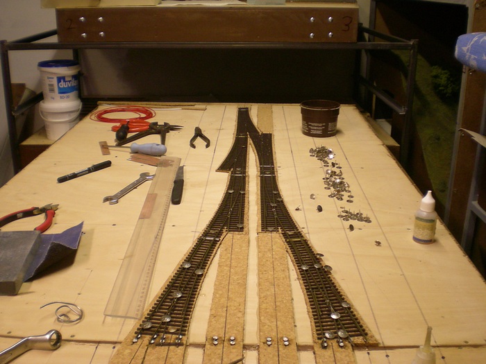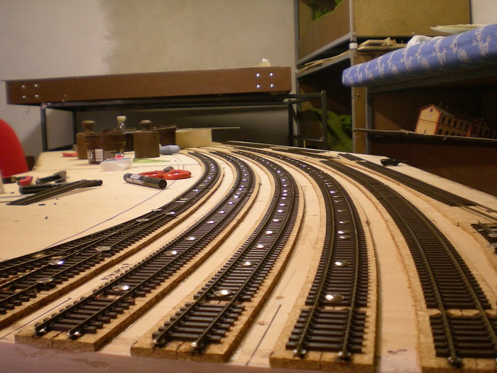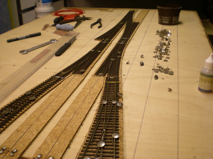 Takze prece se presunuly ba dalsi moduly nadrazi. Na nalepene podlozi doslo k polozeni koleji ke kterym jsem jiz predem naletoval vodice.