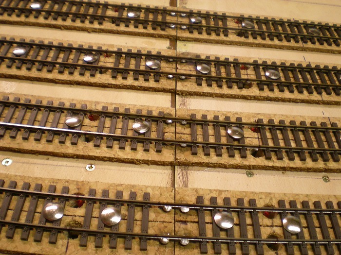 Spoj modulu. Pouzivam klasicke vruty do dreva. Napred je srovnam na potrebnou vysku pomoci kousku koleje navlecene do prazcoveho podlozi. Pak sroubky poletuju a prebytecny cin spilluji. Pak uz jen polozit koleje ktere taky pocinuju. Az je vse naletovane a zafixovane sekundakem tak spoj proriznu zilpil.