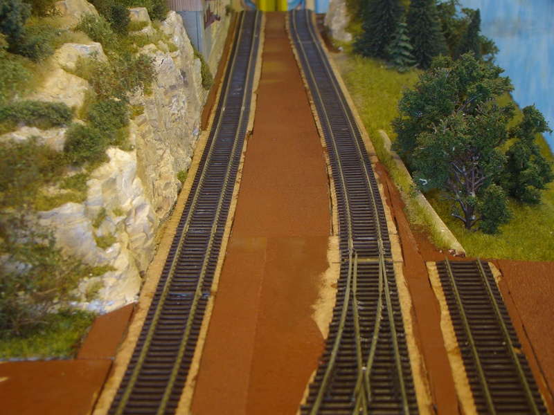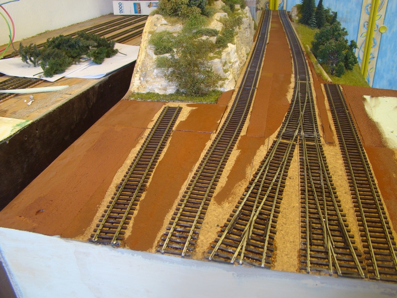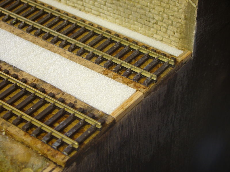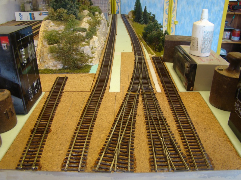 Po letní přestávce kdy jsem budoval 1:1 jsem se opět pustil do pokračování prací na stanici Lom. Po pokládce kolejí jsem vyplnil prostor mezi korkovými pásy pod kolejovým podložím styrodurem nařezaným na tloušťku 4mm.