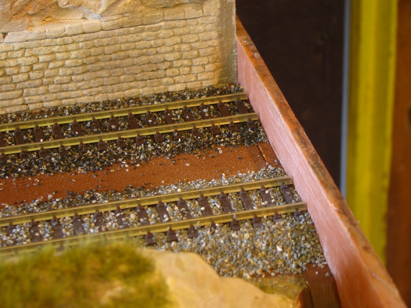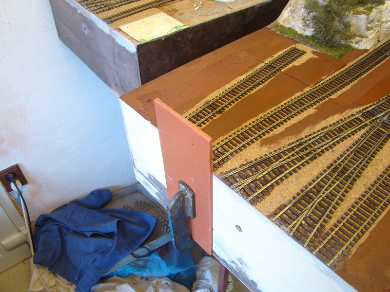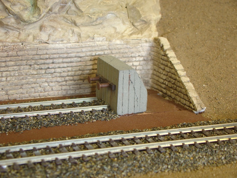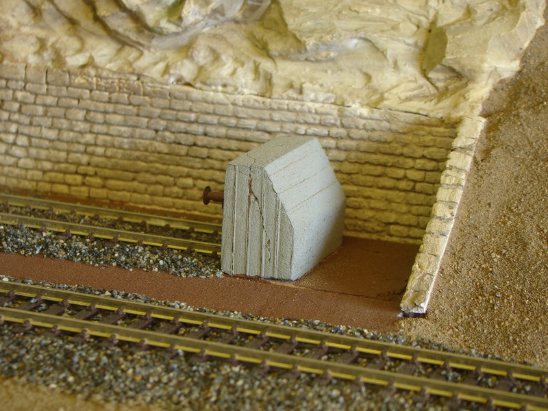 Ještě jsem tvořil šturce. Tentokráte ze styroduru, který jsem vymačkal patou kolejnice abych naznačil prkna při betonáži. Naznačil jsem i praskliny v betonu nožíkem. Pak jsem natřel šturc barvou betonu, nalepil pražec s nárazníky a naznačil stekance rzi hnědou.