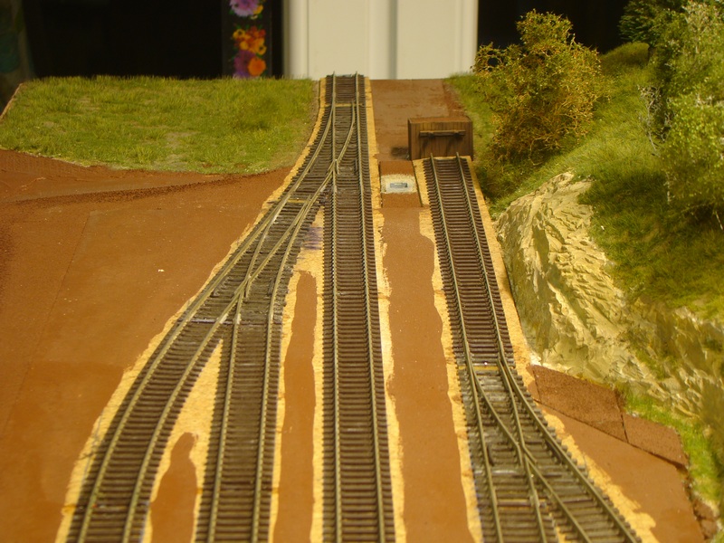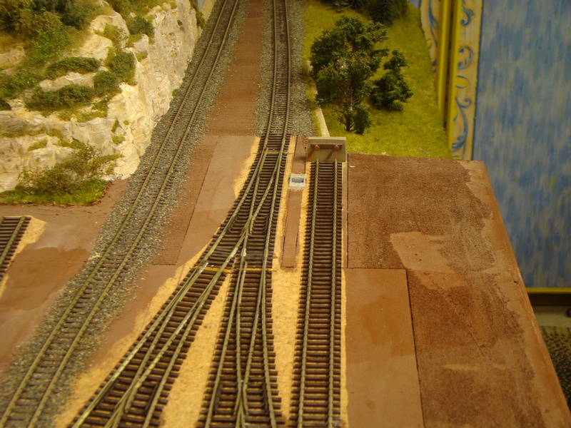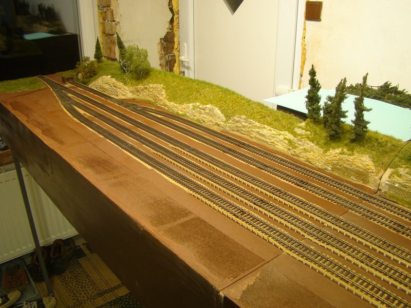 Takhle to vypadá v řezu, tak doufám že mě tama projede vše neboť nemám bohatý lokomotivní ani vozový park takže to nemám jak zkoušet. Nakonec styrodur je poddajný, takže by se nástupiště dalo protlačit když by došlo na nejhorší. Hrany ve spojích jsem zpevnil dvousložkovým tmelem, vysmirkoval a natřel na hnědo. Tady je to jakési ošizené se dívám.