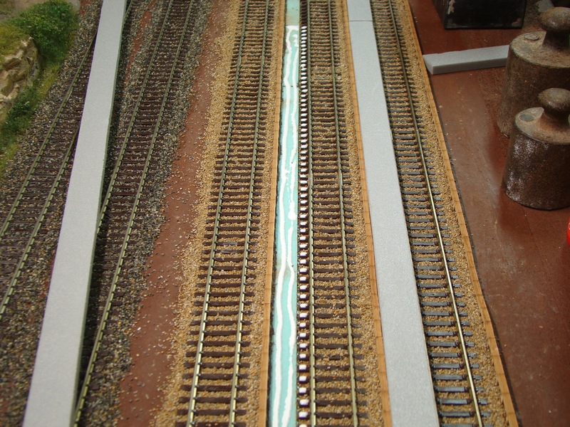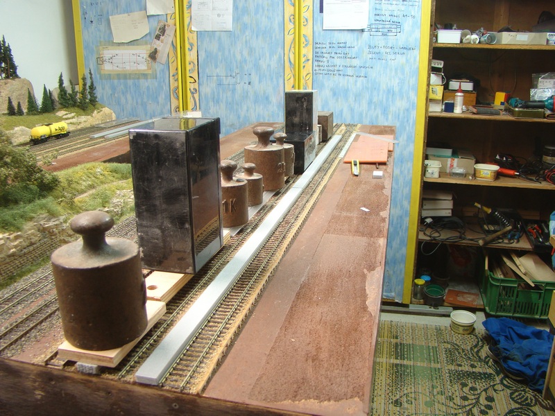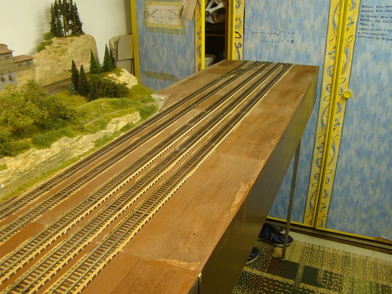 Já jsem hrany lepil tak, že jsem vedle pražcového roštu položil ocelový hranolek 6*6mm a k němu dorážel hrany. Původně jsem měl místo kovového hranolku dřevěný, ale k němu se měly hrany díky lepidlu ze spodu snahu přilepit, takže jsem musel hranolek vytahovat, utírat a znovu vkládat neboť jsem si s hranama pohnul. Díky tomu mám tu hranu tak 11-11,5 mm od hrany kolejnice.