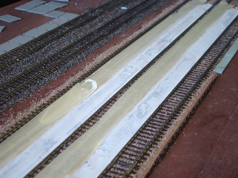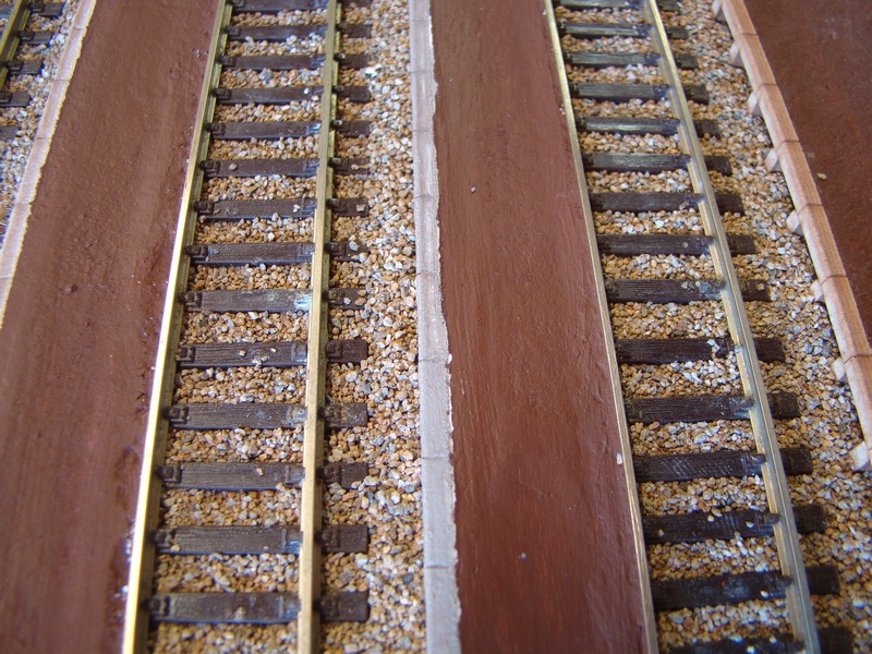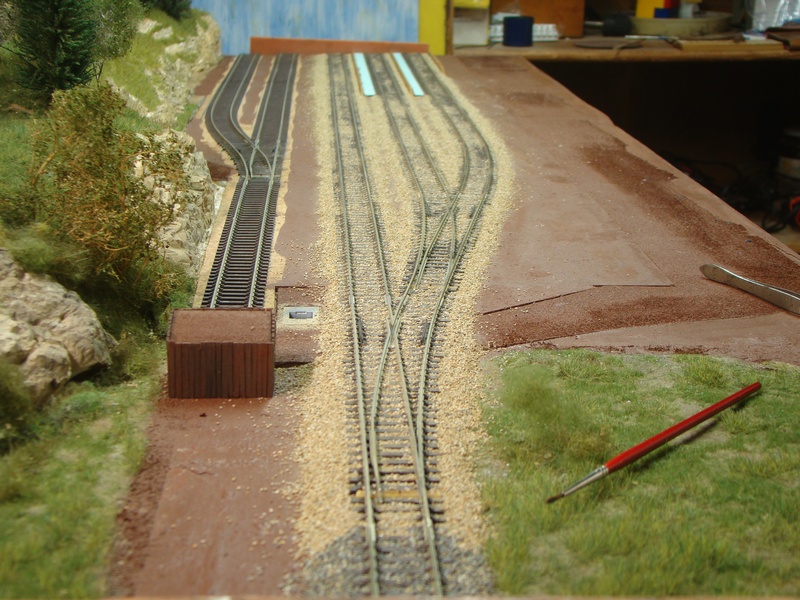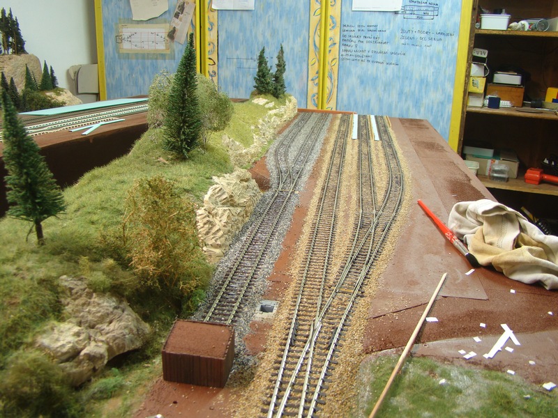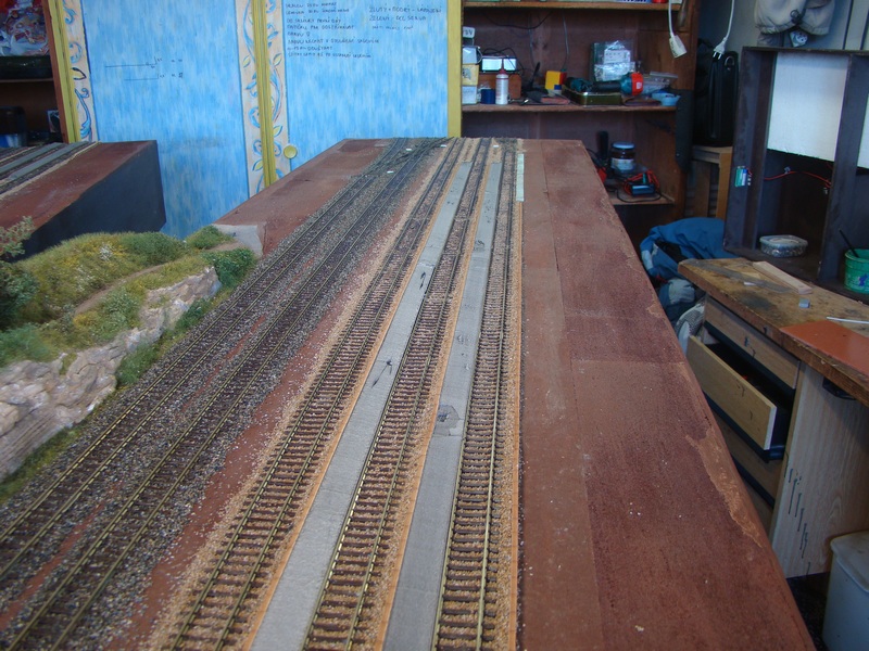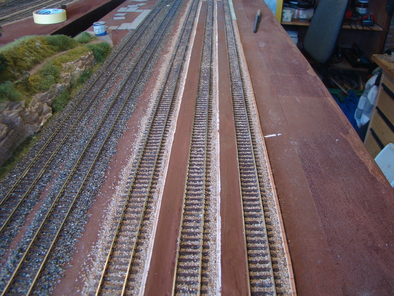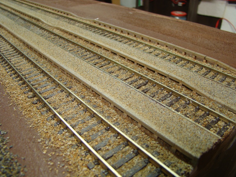 Po vyschnutí tmelu jsem nástupiště přesmirkoval a natřel hnědou barvou. Do toho jsem postupně štěrkoval další části kolejí.