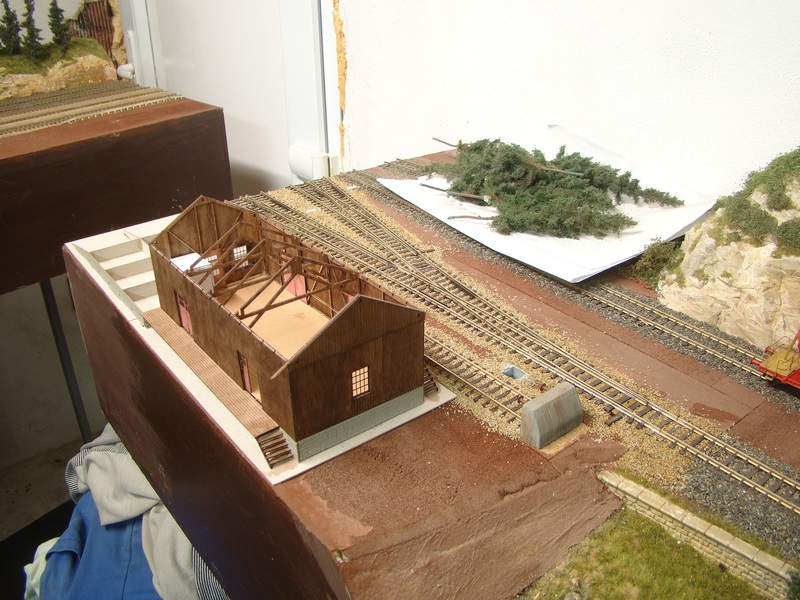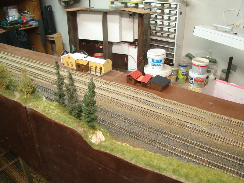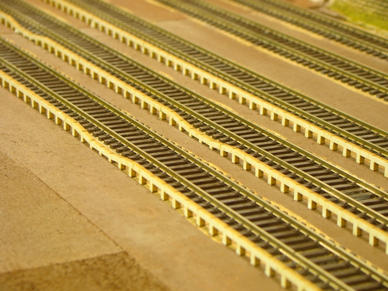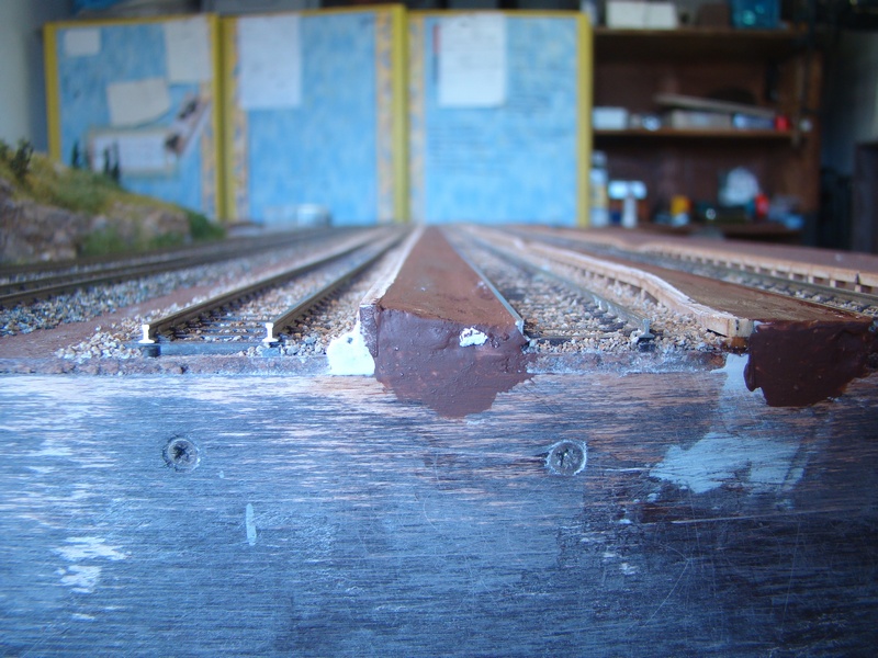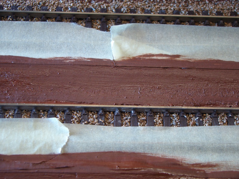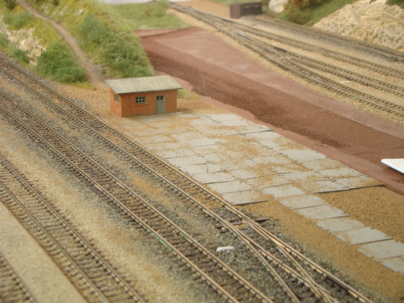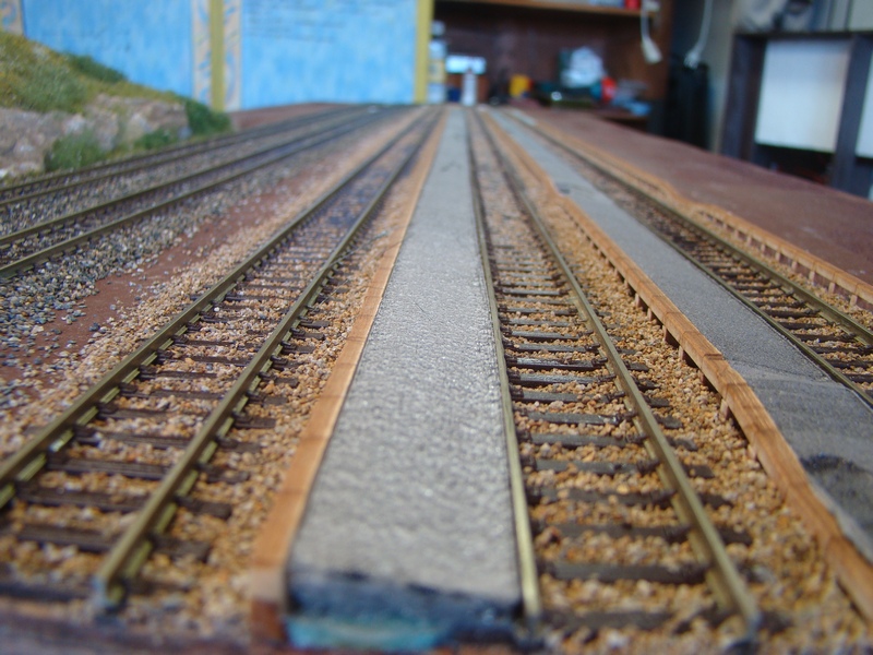 Po vyschnutí tmelu jsem nástupiště přesmirkoval a natřel hnědou barvou. Do toho jsem postupně štěrkoval další části kolejí.