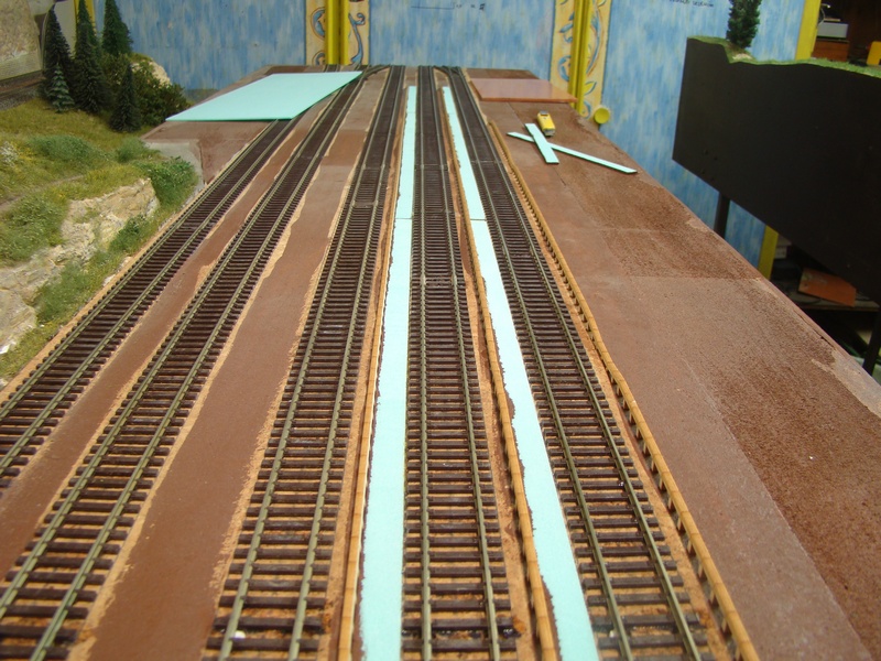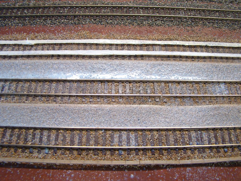 Po zaschnutí hran jsem vyplnil prostor mezi pražcovým roštem a hranama nástupiště styrodurem nařezaným na 2mm tlusté pásky. Hranu směrem k nástupišti jsem natřel hnědou barvou aby mě nesvítil styrodur když by jej nezakryl štěrk. Styrodur jsem lepil duvilaxem. Původně jsem chtěl hrany natřít ředěnou šedou barvou, ale v zápalu práce jsem na to zapomněl a musel jsem je natírat později a už se mě to nedělalo tak jednoduše.