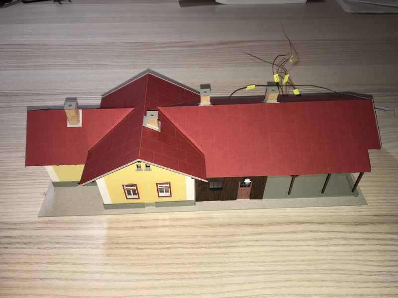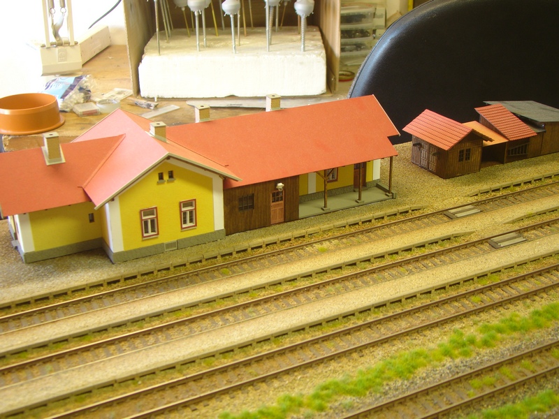 Dále došlo na umístění výpravní budovy a záchodků s šopkama. Obě budovy jsem si obkreslil na modul, prostor pro ně vymaskoval a následně plochy natřel duvilaxem a zasypal hlínou. Následně dosypal nástupiště štěrkem někde něco dosypal a nástupiště prostříkal ředěným sportakrylem. Mezi výpravní budovu a skladiště dolepil dlažbu a opět zasypal hlínou a kterou jsem fixoval ředěným sportakrylem.