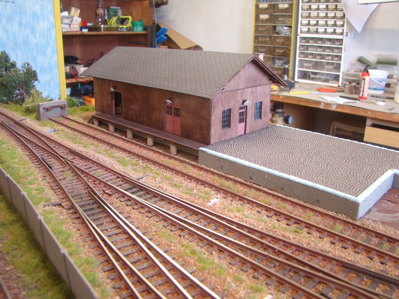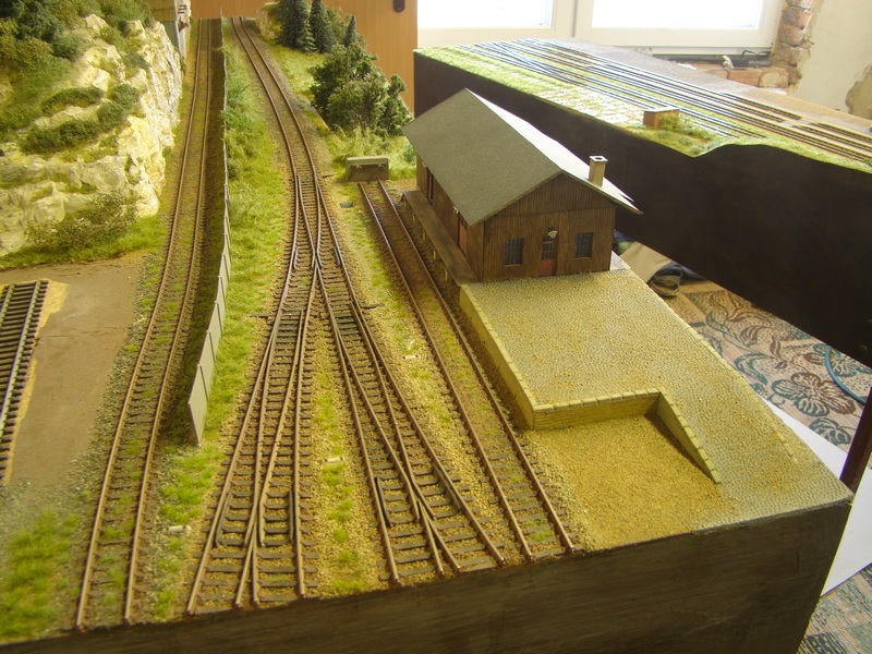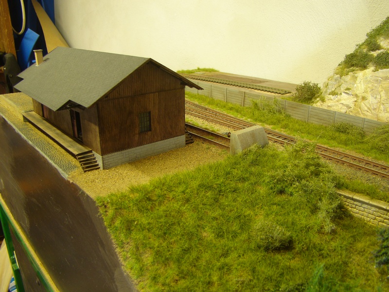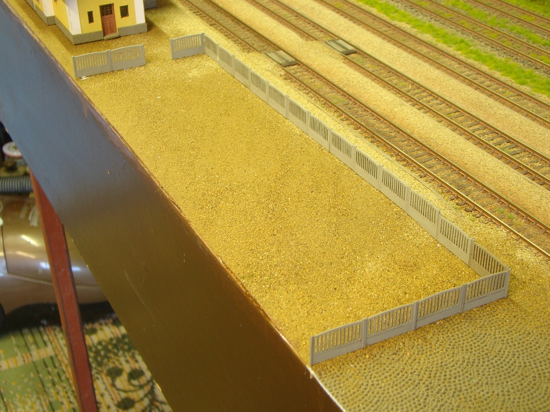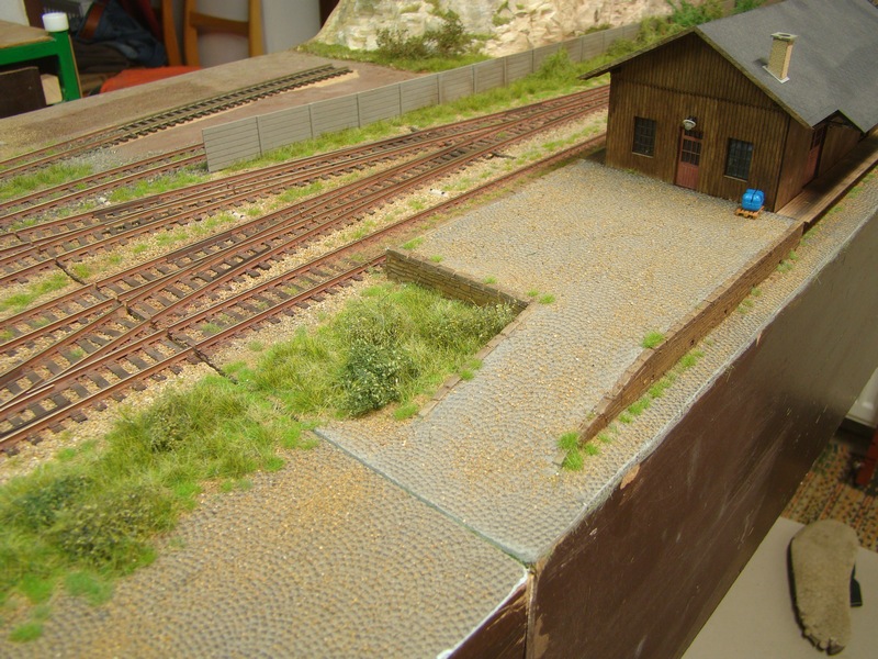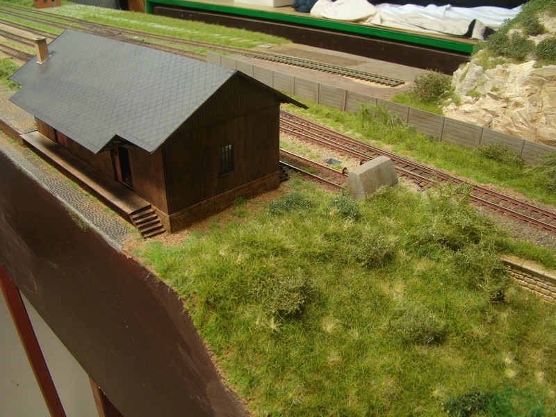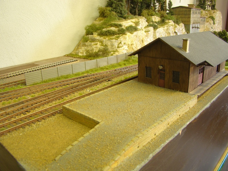 Celou budovu jsem nalepil k modulu akrotmelem. Kolem budovy a na rampu jsem nasypal osytou hlínu doplnil ještě štěrk a vše zafixoval dle rad zkušenějších ředěným sportakrylem 1:1 s vodou.